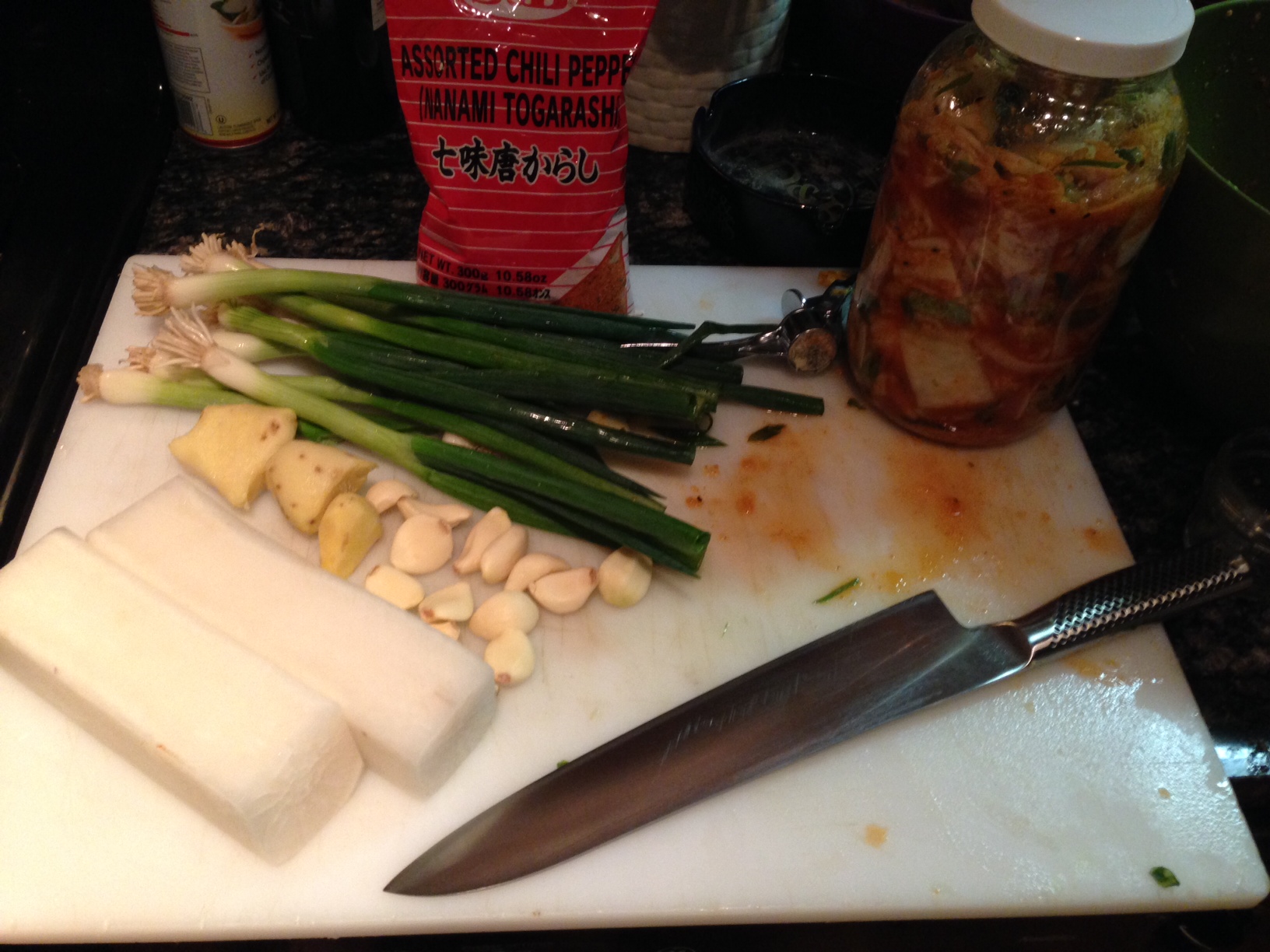 USEFUL TIP: Cut the remaining Daikon Radish into 1/2 inch by half inch cubes and salt just as you did above but let it sit for 3-4 hours in the salt bath. Rinse and Add all the same ingredients as above except for the Nappa Cabbage. Now you have Kimchi Daikon!